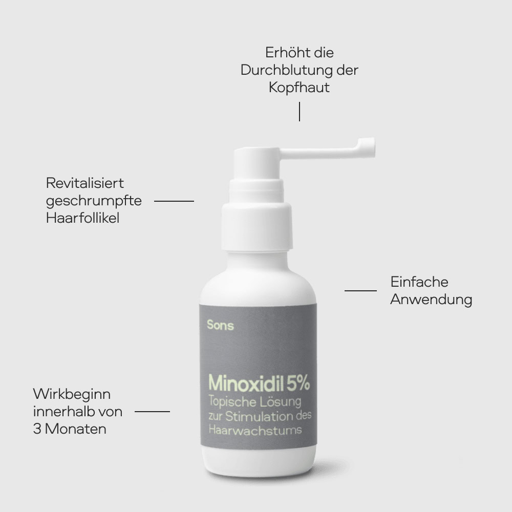 Das Minoxidil-Haarausfall-Spray von Sons reaktiviert und revitalisiert geschrumpfte Haarfollikel, indem es die Durchblutung und Sauerstoffzufuhr zur Kopfhaut erhöht.